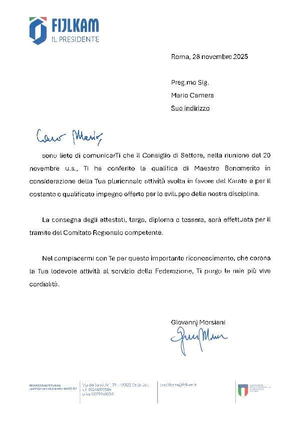La Federazione FIJLKAM in data 20.11.2025, ha conferito al maestro Mario CAMERA la qualifica di Maestro Benemerito, per l'attività svolta a favore della promozione dell'attività svolta in favore del Karate.